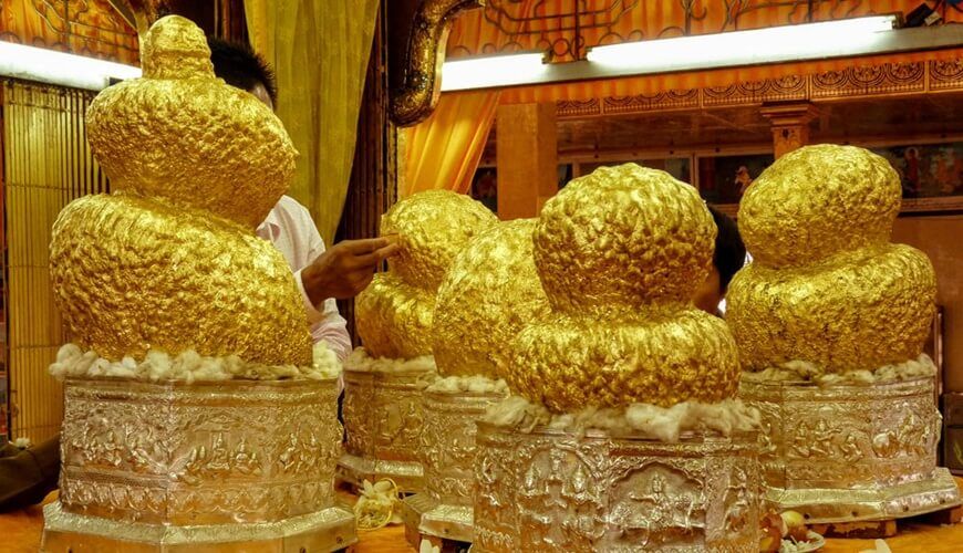 We continue our visit to the main attraction of Inle Lake – Phaung Daw Oo pagoda where is home to 5 precious Buddha images covered completely in gold leaves.
