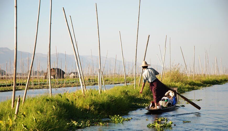 This morning, we pay a visit to the bustling 5-day market on the lake (it is open daily except the dark moon and full moon days of the lunar calendar). The name of the market derives from its characteristic of rotating the location among villages following a scheduled 5 days. En route, we will pass through some villages of Intha people who live in the house – on – stilt, cultivate in the floating garden and master in the incredible one – leg rowing technique.